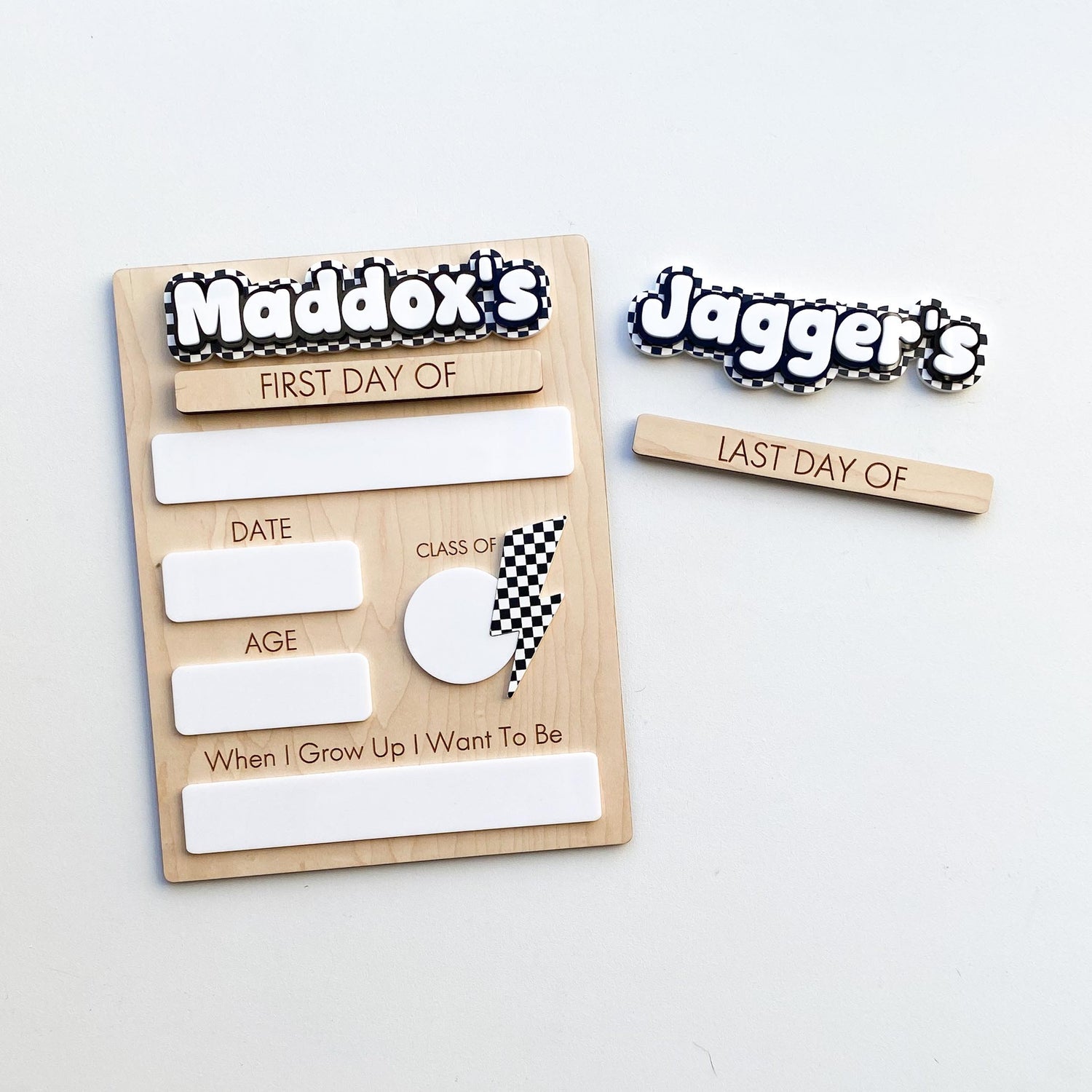 One name is included in original price. Additional names available to add on for an additional cost. Comes with both first and last day of school tags attached with magnets making it easy to switch out to use year round. Sign is approximately 8.5x11. Made with 1/4 wood and 1/8 acrylic pieces. White board is easily erasable when using a dry erase marker.
