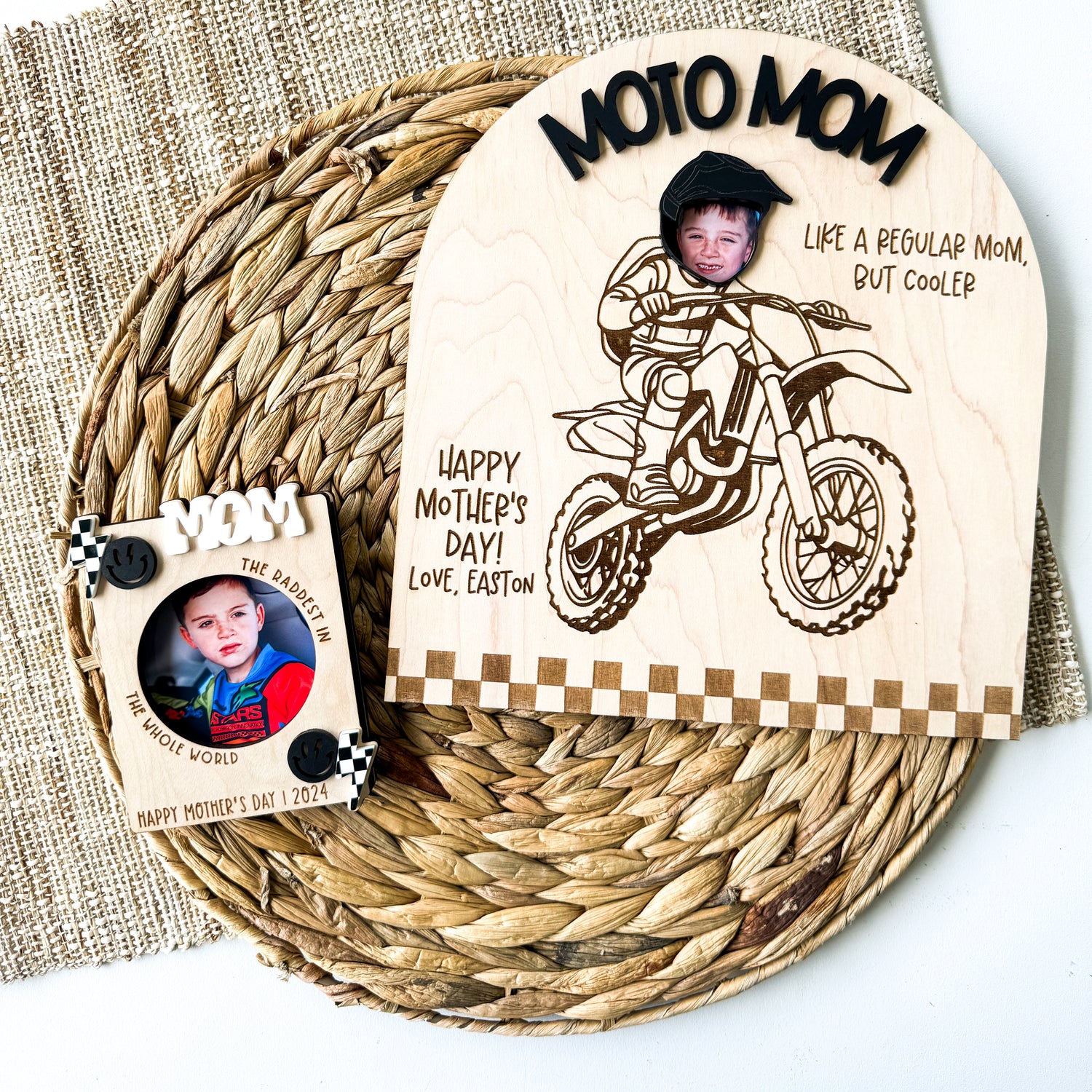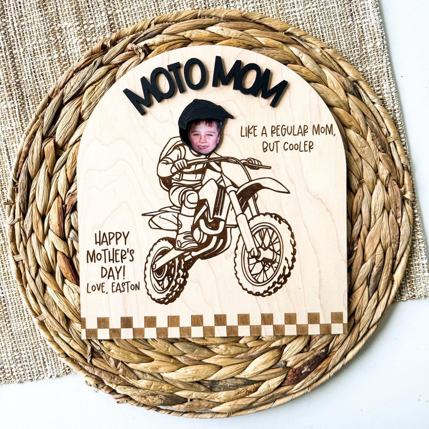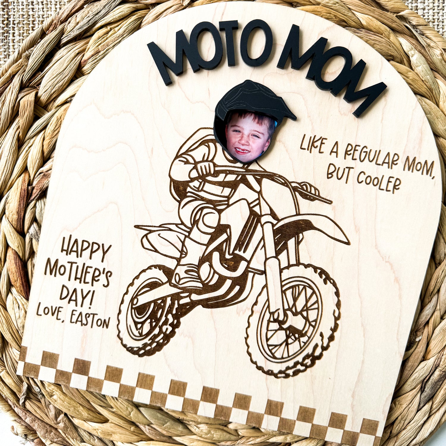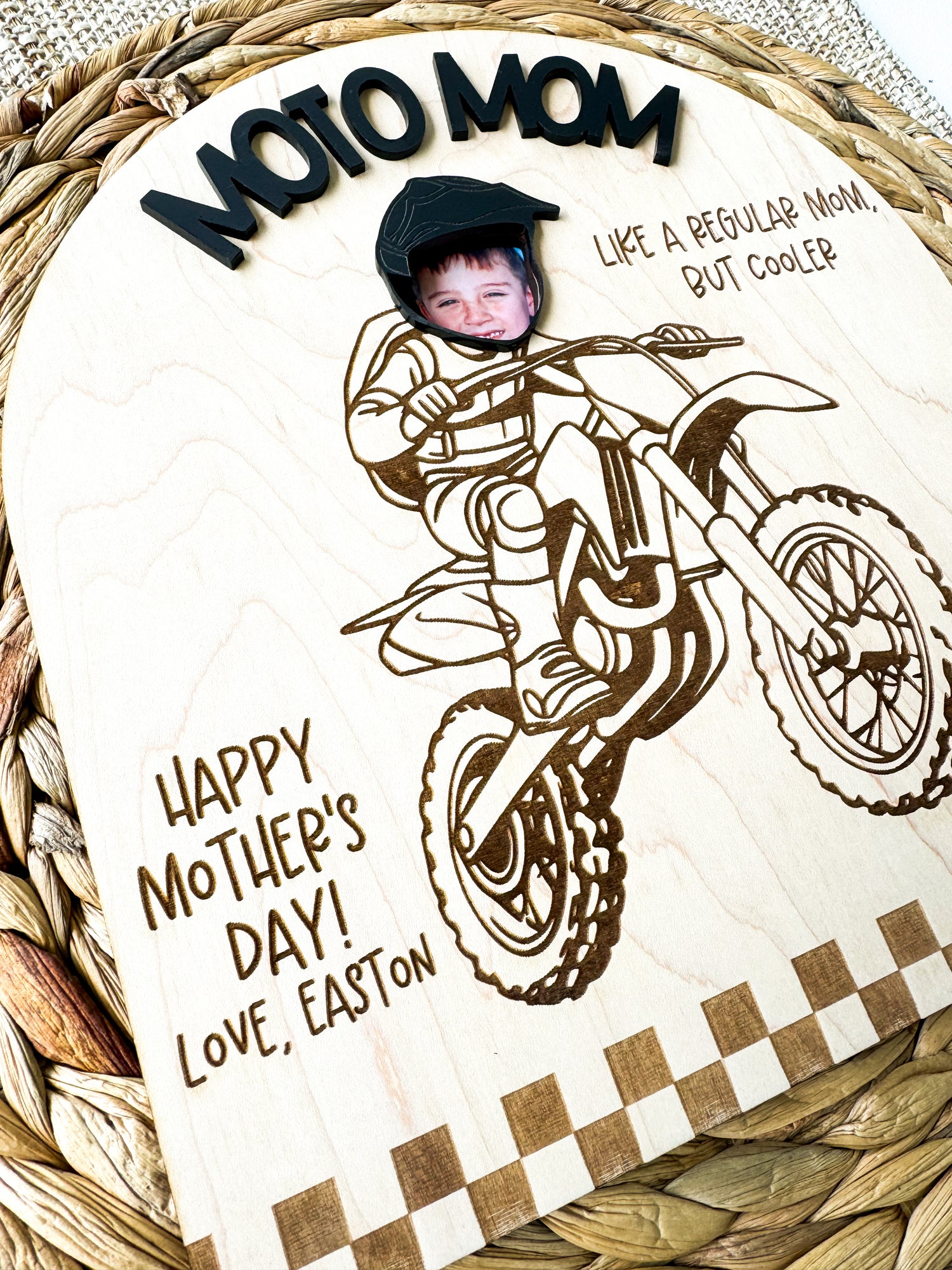 Sign is made of 1/4 maple wood and 1/8 inch cast acrylic. Can be customized with any wording to make it perfect for any occasions or just because. Moto Mom can also be changed to say anything (we can’t forget moto aunts, grandmas, dads, and fans!)