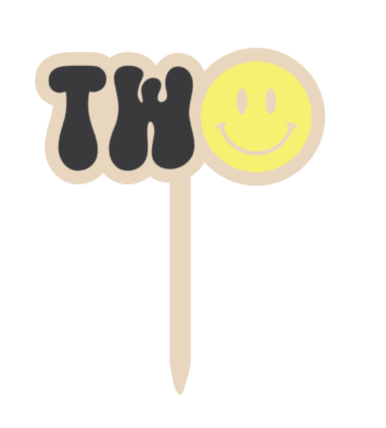 Our TWO Cake Topper Measures approximately 5 inches wide by 5.5 inches tall (including the stake). Can be custom sized to fit your needs. If you choose OTHER for smiley color please be sure to leave a note at checkout or send us a message.